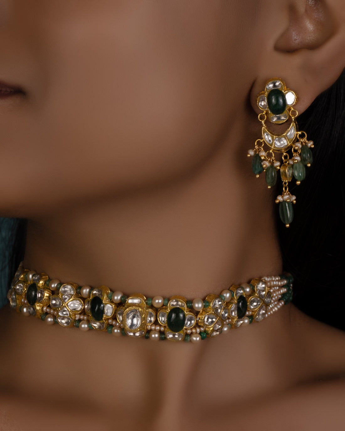 Red and maroon outfits look stunning with Polki chokers and pearl accents. The warmth of Polki beautifully complements deep festive shades, creating a royal bridal-inspired look. Yellow, orange, and green outfits shine when paired with gemstone-embedded Polki pieces, especially emerald-studded earrings or ruby-polished necklaces that enhance the vibrancy of these colours.