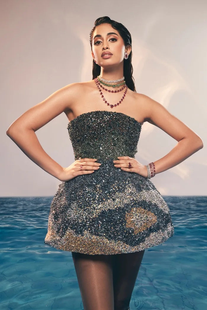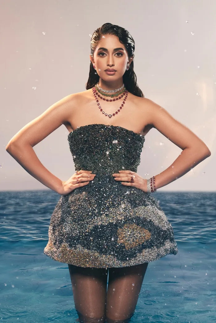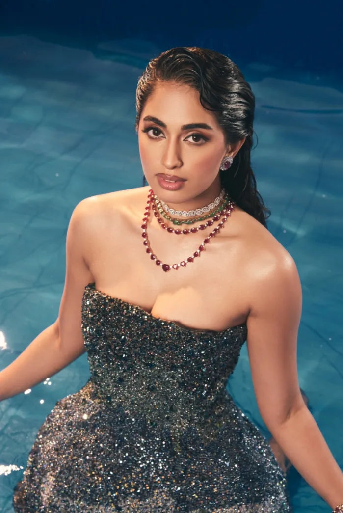 A layered cascade of uncut diamonds finds its voice in Sini Shetty.At the pinnacle of Tyaani’s craftsmanship, these uncut diamonds merge tradition with modernity, reflecting Sini’s distinctive expression of contemporary jewellery artistry.