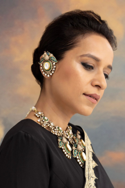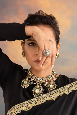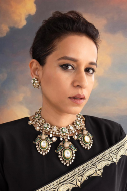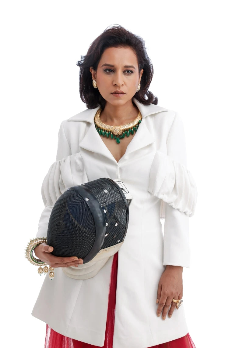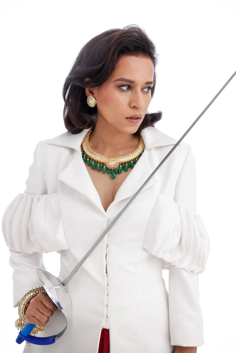 Tillotama Shome meets ornamental splendour sculpted in white, a fencing sabre in hand, her stance tempered with the resolve of a modern heroine. The Tyaani necklace, a radiant collar of uncut diamonds edged with vivid emerald drops, becomes her armour, its craftsmanship echoing power, precision and legacy. Paired with statement studs and layered kadas, the jewellery turns the portrait into a study in discipline and decadence, amplifying her authority and distilling charm into strength.