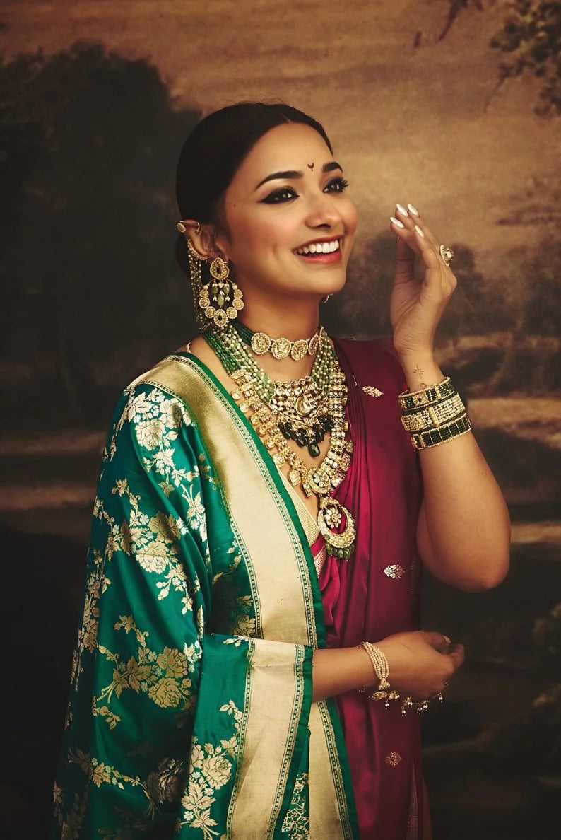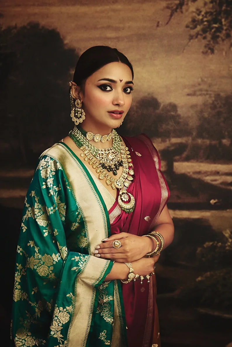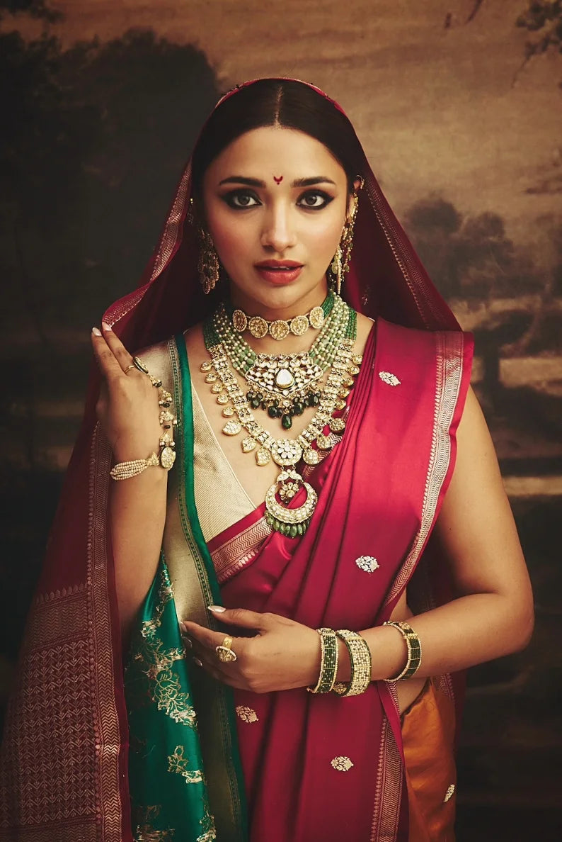 An eternal choice, imagined in layers of gold, uncut diamonds, and beaded detailing. Accented with green, her chokers and long necklaces come together as a modern bridal expression—one destined to become a future heirloom. In Jiya Shankar, the timeless bride finds her reflection: radiant, rooted, and eternal.