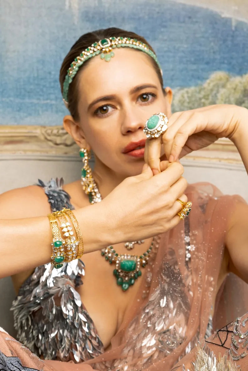 In a vision of deep crimson, Kalki Koechlin channels the dramatic pulse of Victorian grandeur — reimagined in clustered gemstones and antique-finished gold. This look is a tribute to romance and rebellion, drawing from the bold silhouettes and floral storytelling of the grand and romantic eras. Step into your reverie — a personal daydream meant to transport you to the heart of Victorian romance.