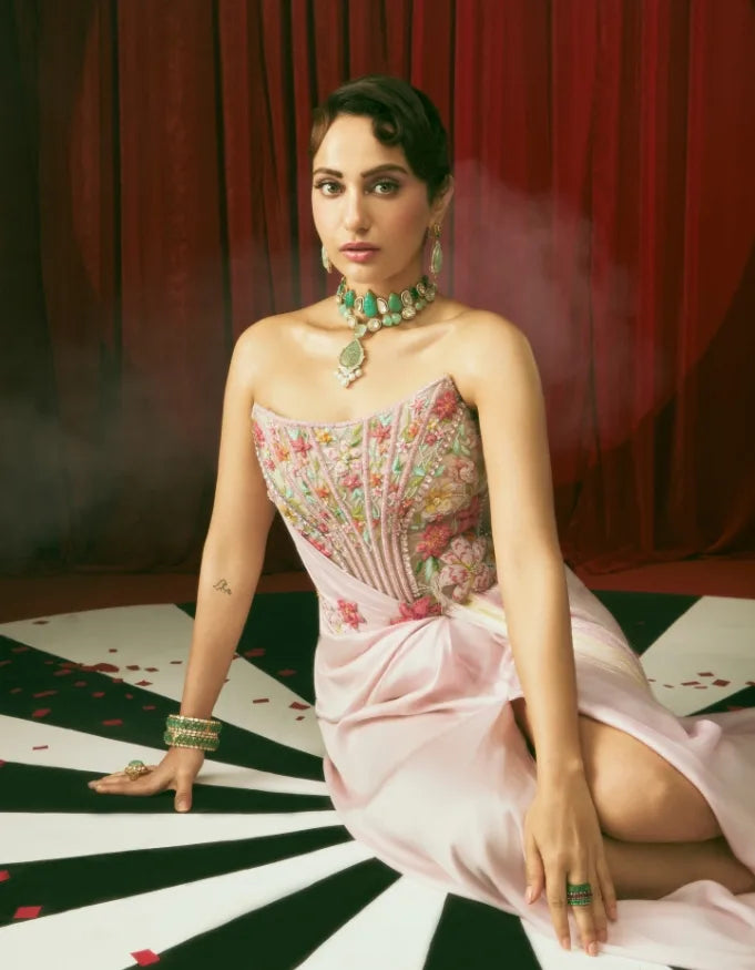Fantasies are openings to endless possibilities, a world where everything shines and gold is a given. So is this ensemble of precious uncut diamonds in magnetic green accents and delicate pearls, formed as a timeless living statement brought to life by the ever-vivacious Kusha Kapila.